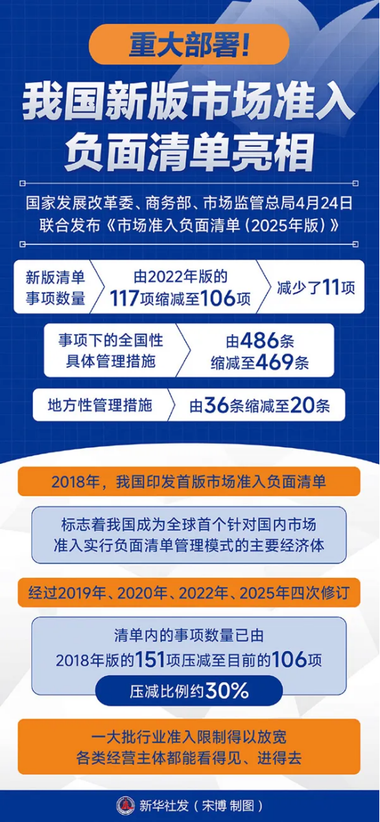 实行统一的市场准入制度,严格落实“全国一张清单”管理模式,是统一市场基础制度的重要内容。2025年4月24日,《市场准入负面清单(2025年版)》发布,新版清单事项数量由2022年版的117项缩减至106项,减少了11项。 新华社发 宋博/制图