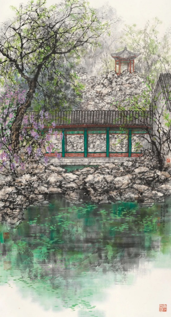 王明明先生自幼浸润传统文化,酷爱书画艺术,师承李苦禅、蒋兆和、周思聪等艺术大家。在几十年的创作生涯中,对人物画、花鸟画、山水画以及书法进行深入研究,遍读传统画论,精研中国美学精神,找寻中国画中蕴含着的传统文化脉络,体悟千余年来养成的中国画之“法度”,深耕创作,并于创作中不断吸收、选择、取舍、内化、变革,于笔墨灵韵间执着探求中国意境的表达,得以创作出这一系列中国古典园林绘画作品。
