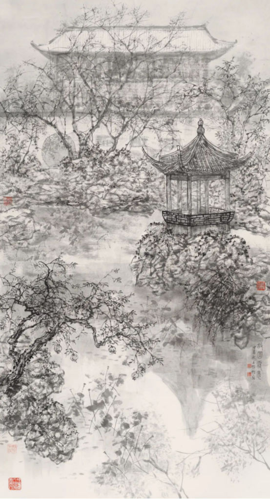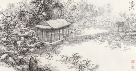 本次展出的作品蕴含着王明明先生对中国古典园林的深入理解。明人计成所言“虽由人作,宛自天开”,陈从周先生所提倡的“诗情画意”,宗白华先生之“飞动之美”与“自然情致”等园林美学的经典理论,都被王明明先生以笔墨情致予以表达。濠濮间雪景、静心斋秋韵、颐和园古松、堆秀山朝霞以干湿浓淡的墨韵化减了皇家园林所固有的庙堂气象,形成超然物外的清雅之感;片石山房的叠石与倒影、五峰仙馆之春兰与枯木、秋轩之清霜与水影无不彰显着中国古典文人园林的秀美清新与典雅古韵;四时园林景致中的花草树木、亭台谢宇、雪雨秋霜以实景写虚境,表达悠然安逸的梦里桃花源。它们是园林之景,更是王明明先生的心中意境;既是对自然万物的深情观照,更是对“唯道集虚”哲学境界的诗意表达。