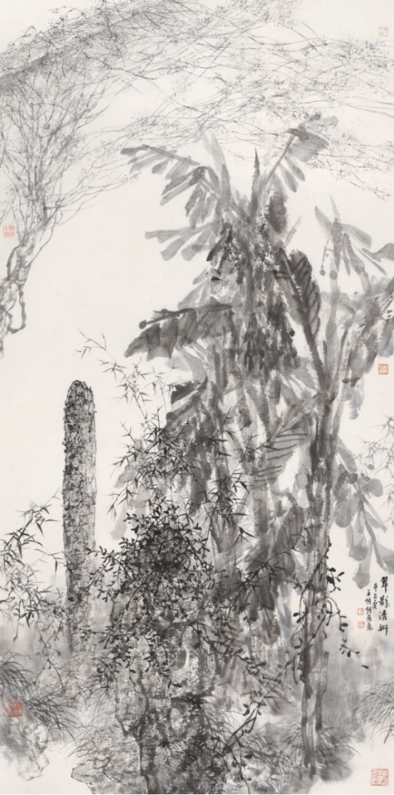 作品题材广泛,立足中国画传统美学的意境表达,突破山水、花鸟、人物绘画题材的界限,强调在大自然中的发现以及个人修养的顿悟与渐修,形成了独特的个人风格。