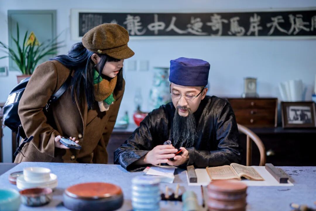 齐白石扮演者拈笔含笑与观众互动,艺术在此刻共鸣